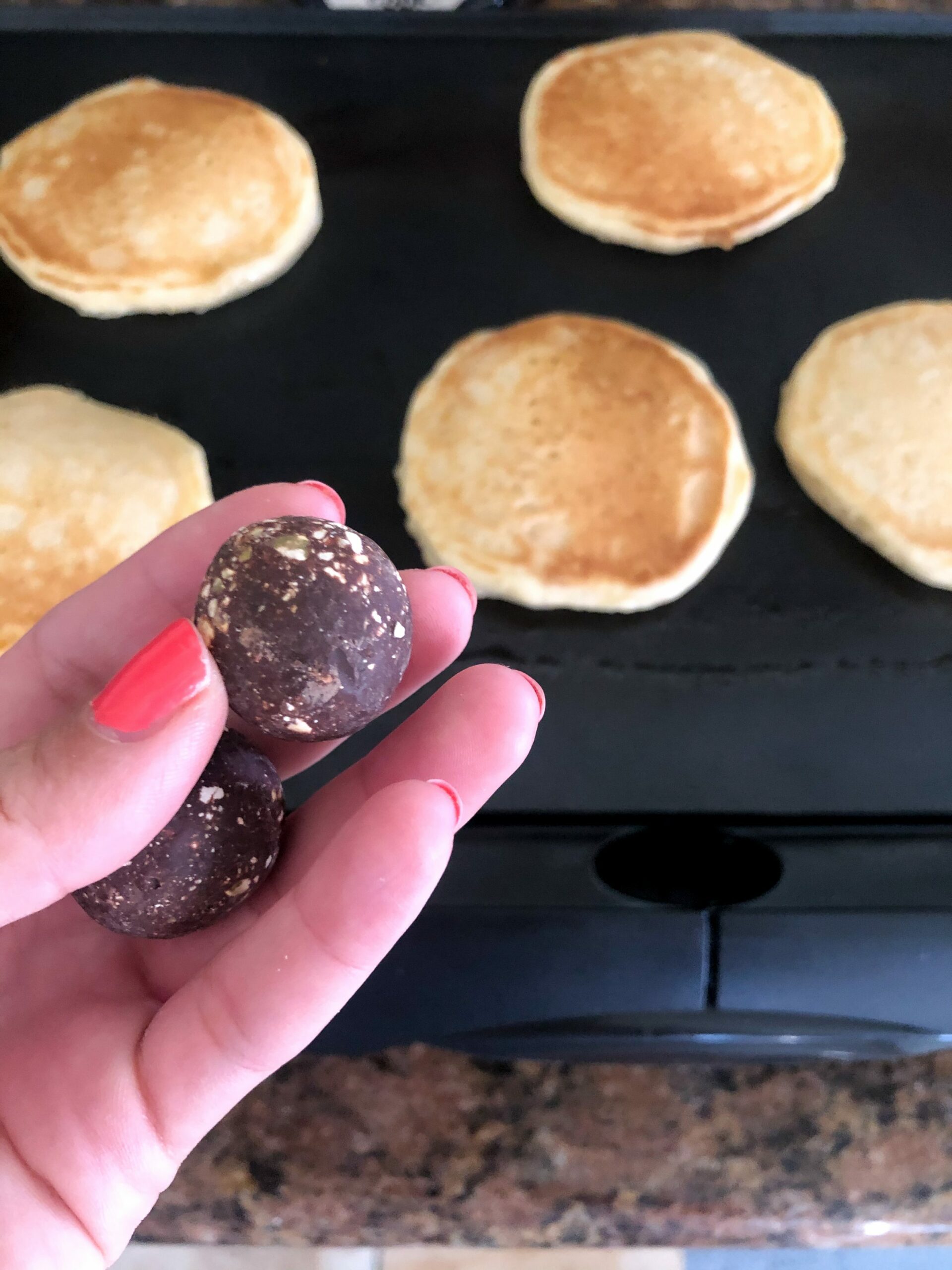 8:30am: We all sleep until 8 (!) so I eat a few Enjoy Life protein balls while I start the coffee maker and make the girls their favorite fluffy pancakes with scrambled eggs and strawberries.