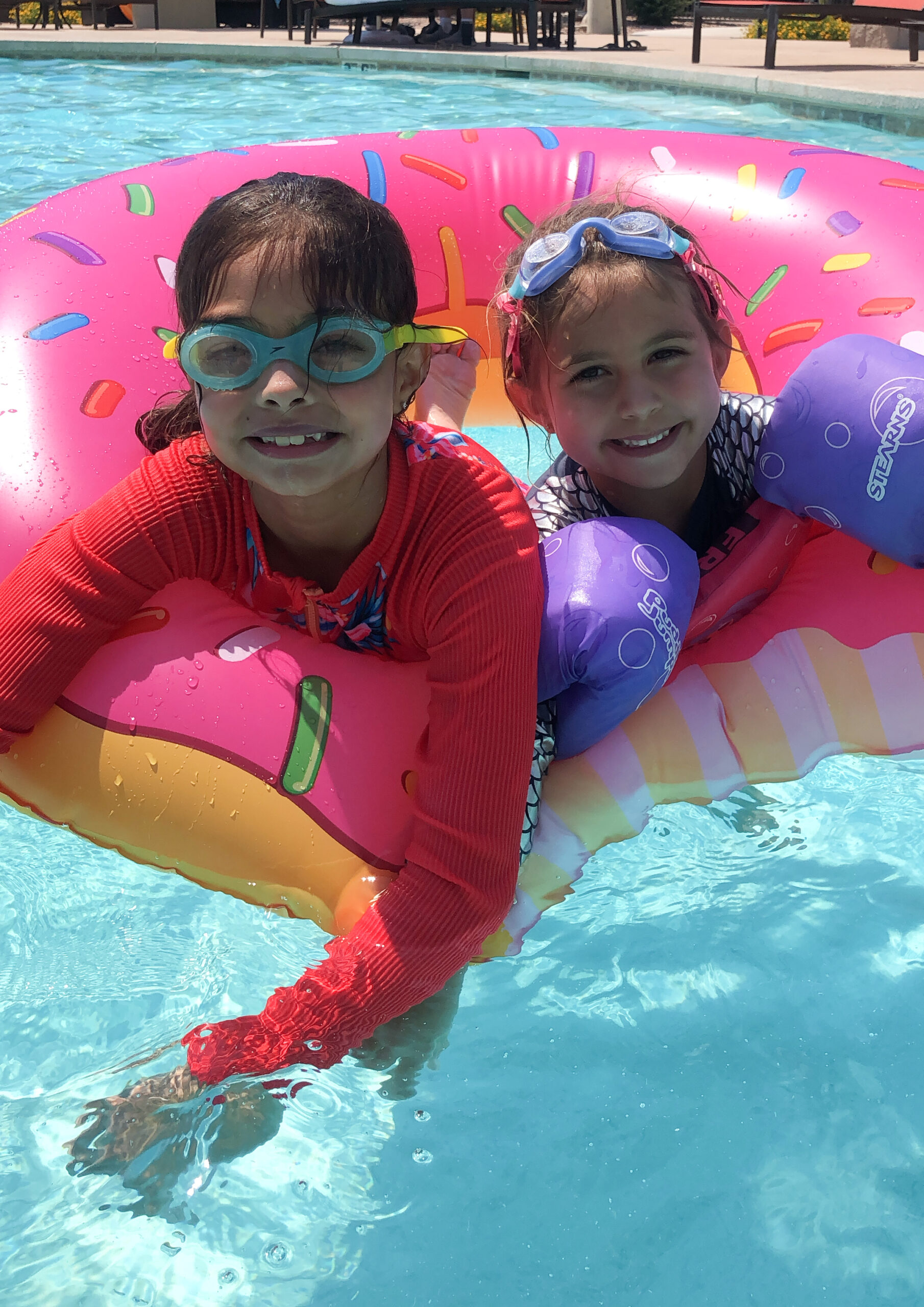12:30pm: We head to the pool and take our giant inflatable donut with us. We meet up with some friends and the girls all play in the water wearing mermaid tails, while my friend, the Pilot, and I chat in the tanning ledge area. I also practice a bit of swimming with P – she’s getting so good at swimming without her puddle jumper!